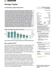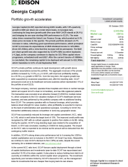 Receive Edison's Research on Georgia Capital in real-time View Reports Portfolio growth accelerates Download PDF / 126.98 KB October 30, 2025 Accelerating capital deployment Download PDF / 363.56 KB October 13, 2025 Strong portfolio at a substantial discount Download PDF / 153.93 KB May 19, 2025 Successful disposal from the portfolio Download PDF / 305.34 KB Dec 04, 2024 Business as usual despite political turmoil Download PDF / 319.39 KB Sep 03, 2024 Georgia Capital - Equity Proposition View Report Mar 28, 2024 FY23 NAV TR of 20% in sterling terms Download PDF / 168.82 KB Feb 23, 2024 Successful bond refinancing improves risk profile Download PDF / 230.46 KB Sep 07, 2023 Nearing deleveraging target Download PDF / 267.76 KB Mar 08, 2023 Benefiting from strong macro tailwinds in Georgia Download PDF / 366.17 KB Nov 25, 2022 NAV per share stable in local currency in Q222 Download PDF / 216.69 KB Aug 25, 2022 A portfolio of market leaders in Georgia Download PDF / 509.49 KB May 31, 2022 Sale of majority stake in the water utility business Download PDF / 245.6 KB Jan 05, 2022 Value creation on the back of macro recovery Download PDF / 361.97 KB Sep 13, 2021 Solid positive revaluations in Q420 Download PDF / 359.43 KB Mar 05, 2021 A private equity play on Georgia Download PDF / 640.12 KB Dec 08, 2020