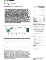 Receive Edison's Research on Georgia Capital in real-time View Reports Georgia Capital — FY25 NAV total return of over 60% Download PDF / 200.79 KB February 26, 2026 Portfolio growth accelerates Download PDF / 126.98 KB October 30, 2025 Accelerating capital deployment Download PDF / 363.56 KB October 13, 2025 Strong portfolio at a substantial discount Download PDF / 153.93 KB May 19, 2025 Successful disposal from the portfolio Download PDF / 305.34 KB Dec 04, 2024 Business as usual despite political turmoil Download PDF / 319.39 KB Sep 03, 2024 Georgia Capital - Equity Proposition View Report Mar 28, 2024 FY23 NAV TR of 20% in sterling terms Download PDF / 168.82 KB Feb 23, 2024 Successful bond refinancing improves risk profile Download PDF / 230.46 KB Sep 07, 2023 Nearing deleveraging target Download PDF / 267.76 KB Mar 08, 2023 Benefiting from strong macro tailwinds in Georgia Download PDF / 366.17 KB Nov 25, 2022 NAV per share stable in local currency in Q222 Download PDF / 216.69 KB Aug 25, 2022 A portfolio of market leaders in Georgia Download PDF / 509.49 KB May 31, 2022 Sale of majority stake in the water utility business Download PDF / 245.6 KB Jan 05, 2022 Value creation on the back of macro recovery Download PDF / 361.97 KB Sep 13, 2021 Solid positive revaluations in Q420 Download PDF / 359.43 KB Mar 05, 2021 A private equity play on Georgia Download PDF / 640.12 KB Dec 08, 2020